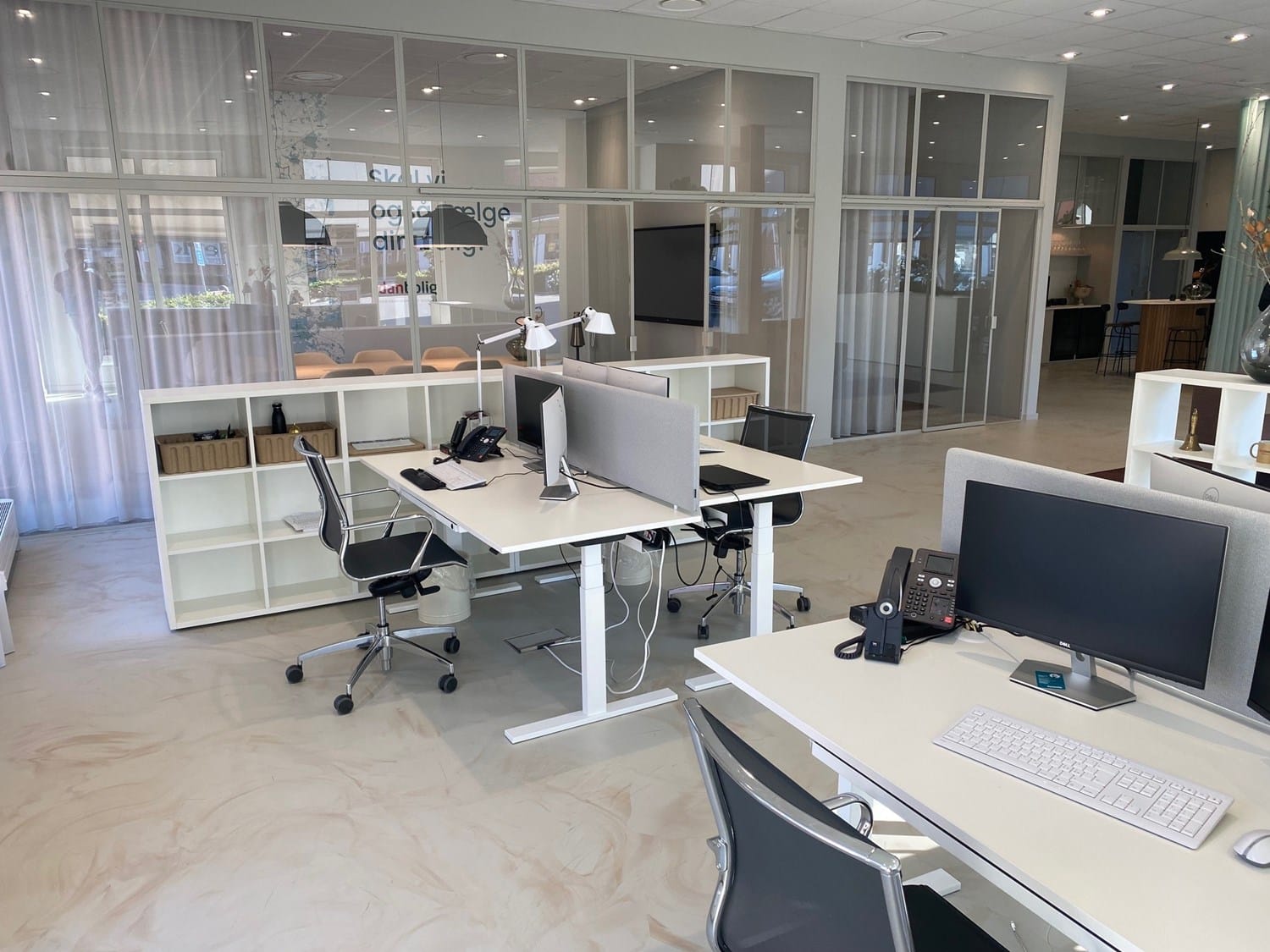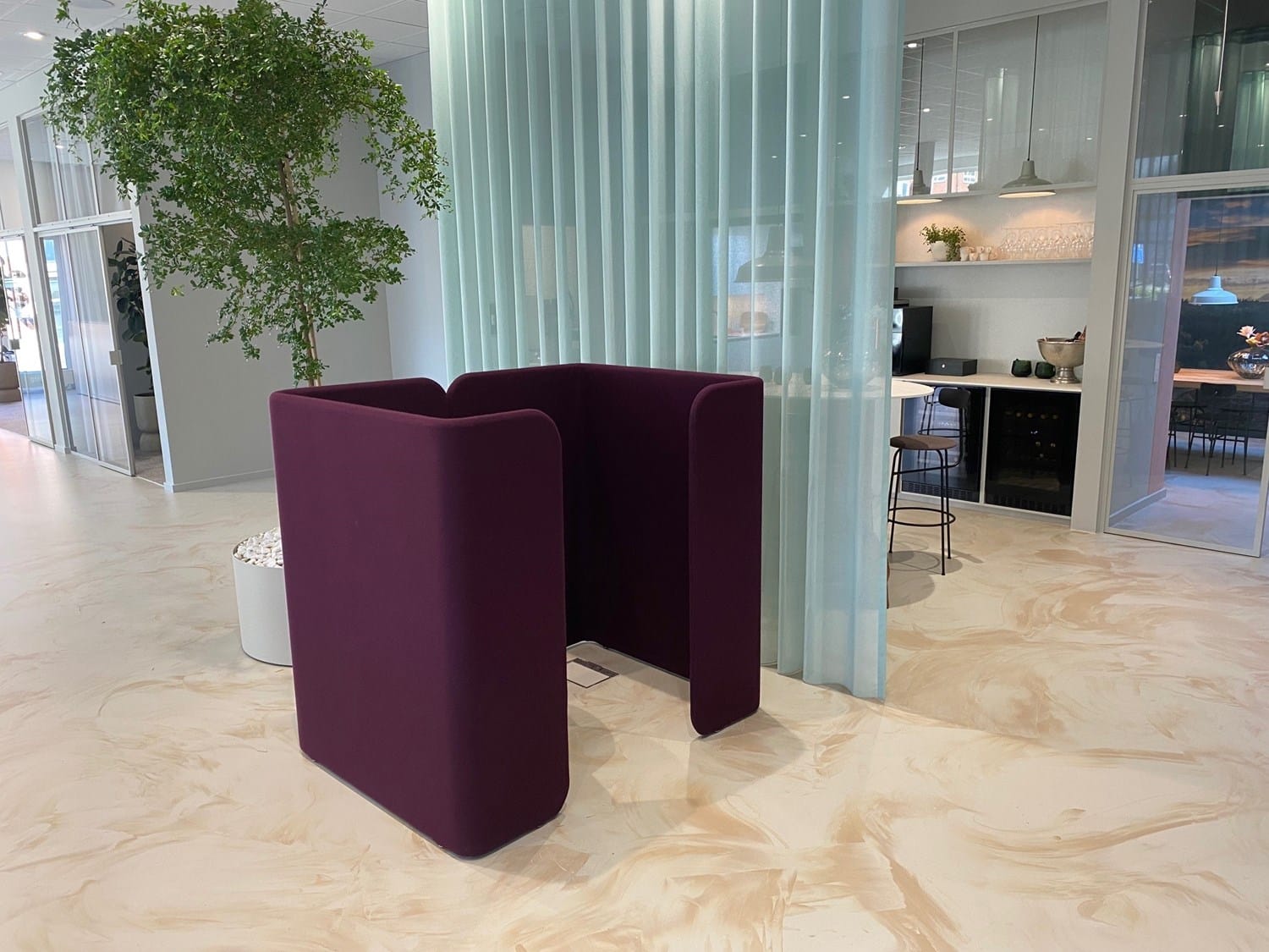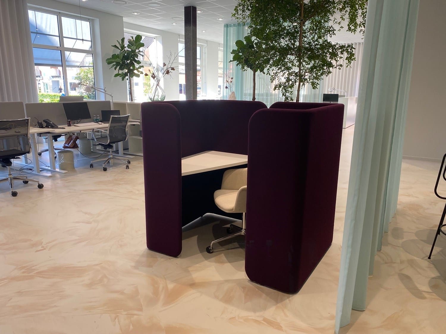 ELLE kontorstolen, reoler med og uden bagbeklædning, FAREL belysning med akustiske egenskaber samt HUG POD, det ”lille møderum” placeres i rummet men med plads til fordybelse og samtale.