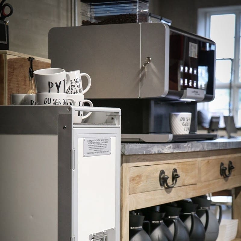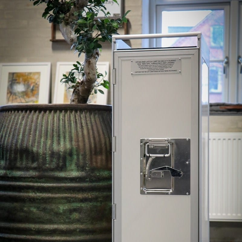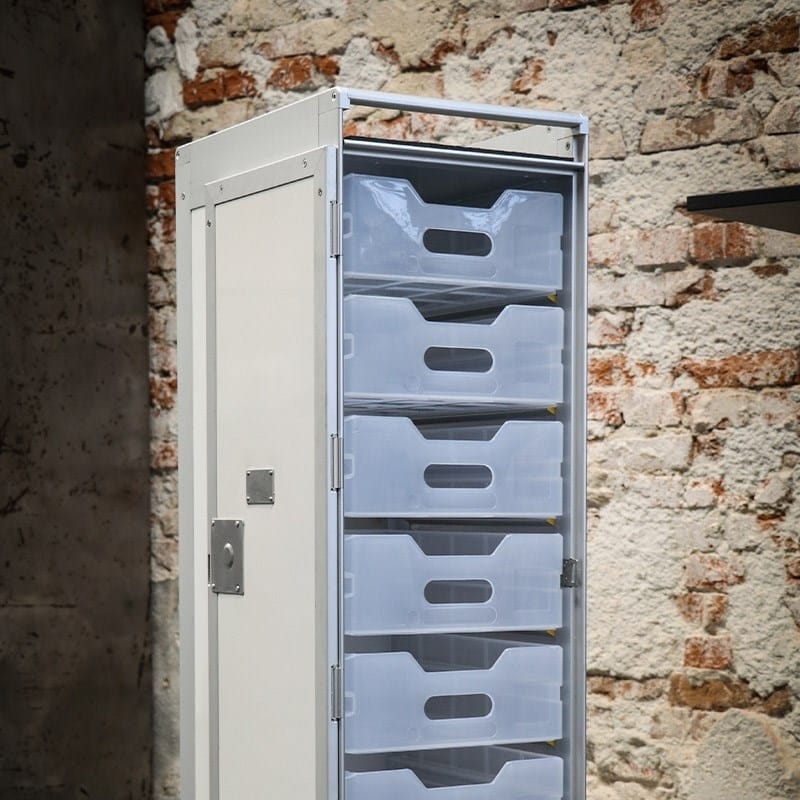 Denne unikke, mobile og multifunktionelle form for møbeltype er et redesign af den velkendte airplane-trolley. Den kan bruges som fancy minibar eller til opbevaring på kontoret eller møderum. Det er muligt selv at kombinere din egen version ved valg af skuffer og/eller hylder.