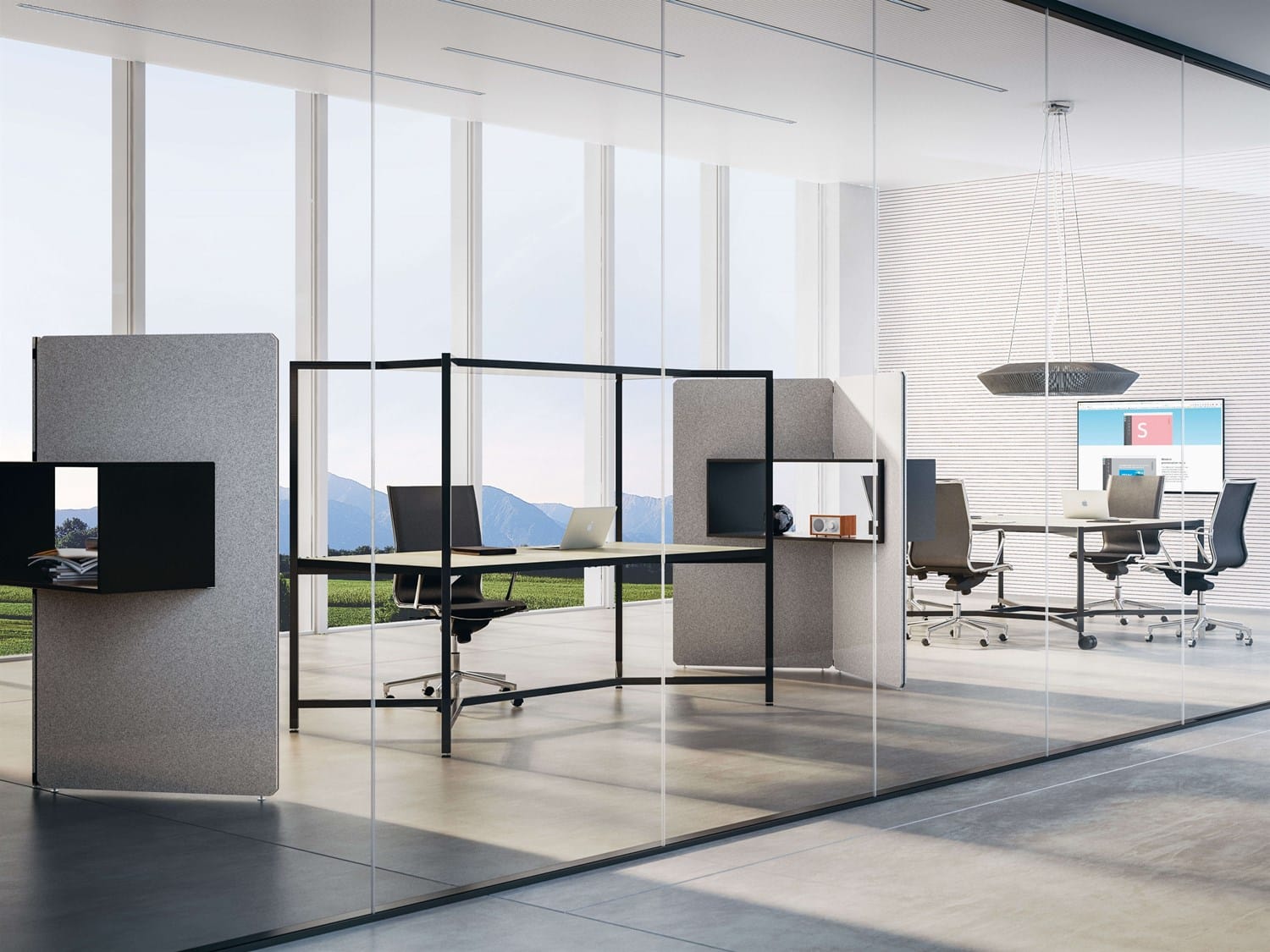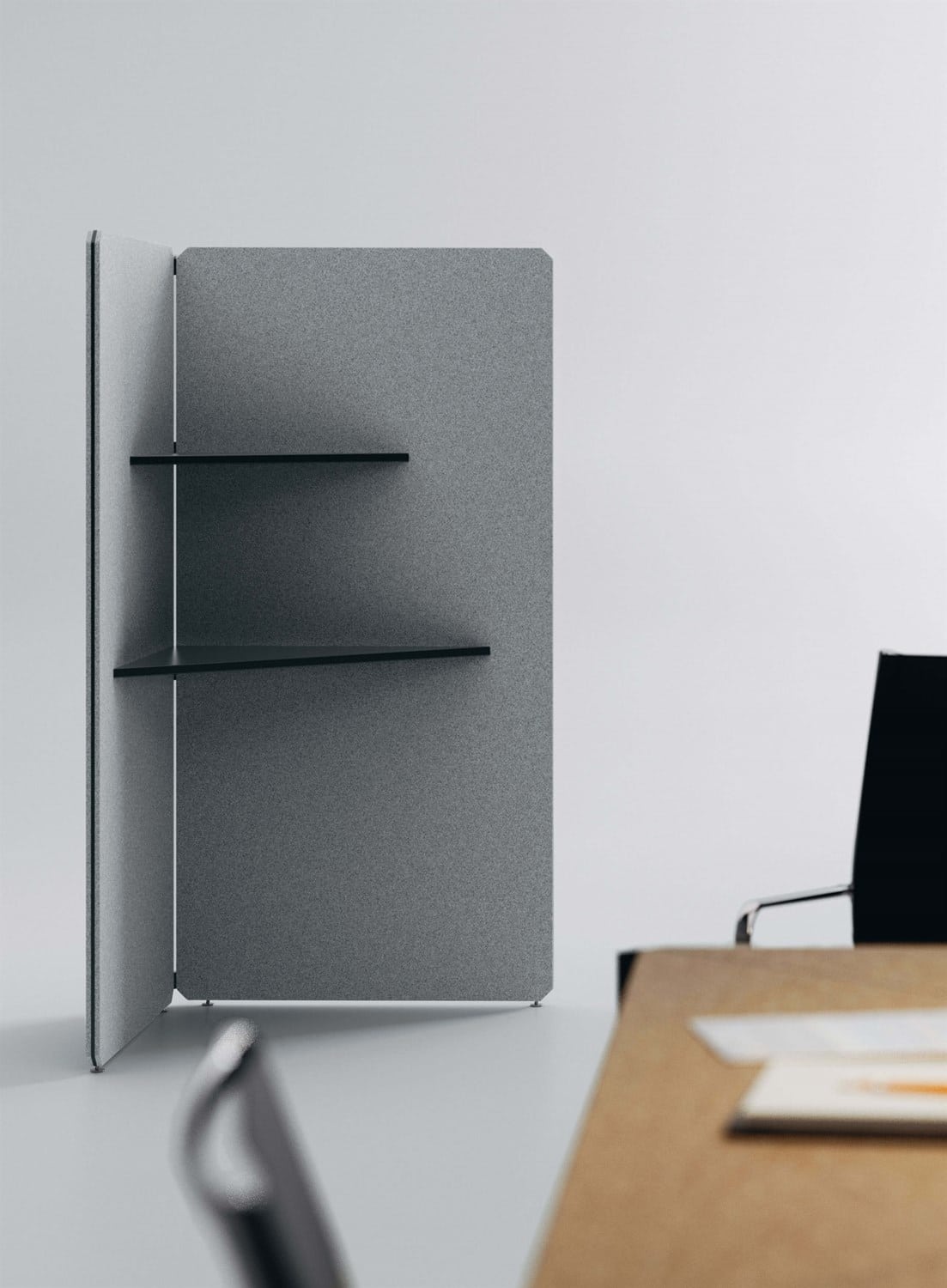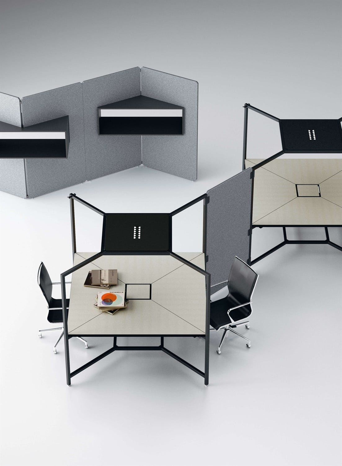 Hub-serien er kendetegnet ved selvstående, stofbeklædte skærmvægge udstyret med hylder og åbne skabselementer. Et lukket men alligevel transparant indretning af lokaler med plads til fordybelse og fællesskab.
