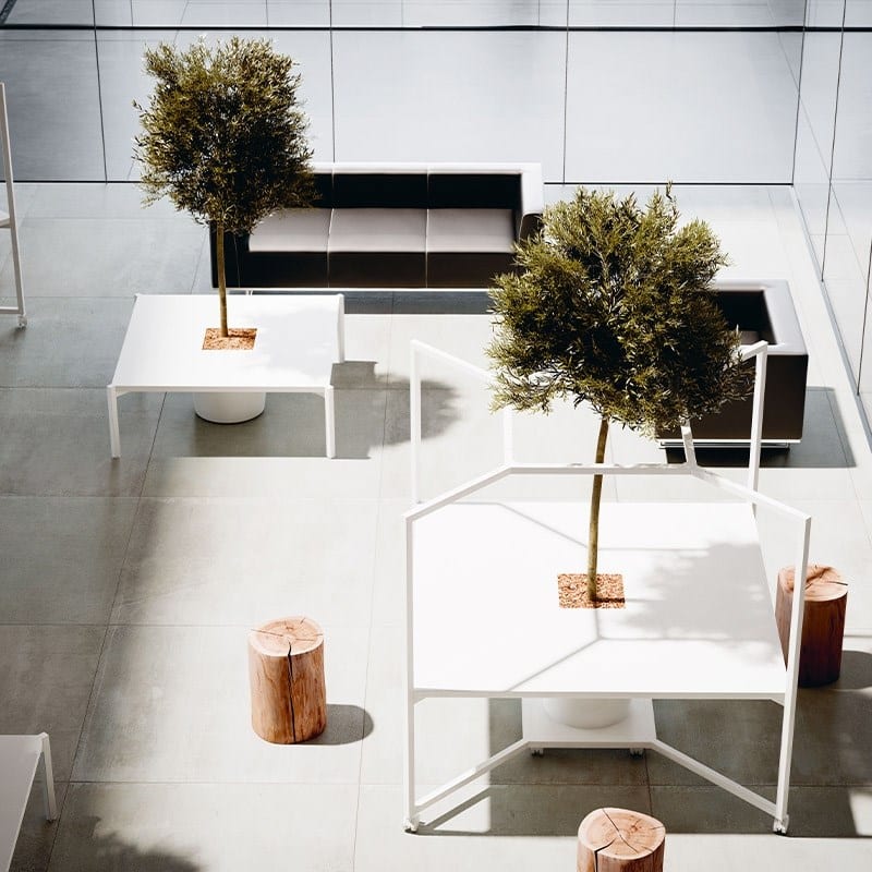 HUB serien findes med eller uden ”tag”. Modulerne med ”tag” har samme egenskaber som H: 75 cm moduler plus de opretstående profiler i 160 cm høje som støtter et firkantet overliggende panel. Overhead tværramme med svejste profiler til fastgørelse af træhylden og overliggende panel. Mulighed for LED lys i ”taget”.