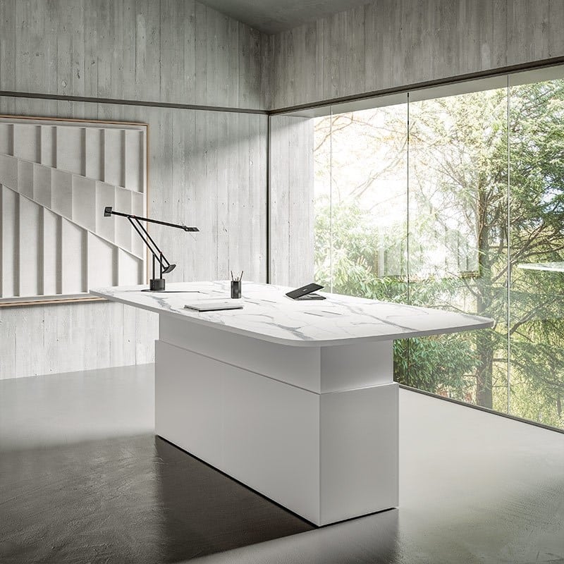 Alle borde i fast højde, består af en 28 mm tykt melamin beklædt spånplade top. Det justerbare bord med metalbund har en særlig højdejusteringsmekanisme som modvægter bordpladen uden behov for el eller gasdrevne pumper. Toppen af dette bordet er 18 mm tykt og kan tåle en belastning på op til 5 kg i vægt uden kompromittere væskebevægelsen af mekanismen.